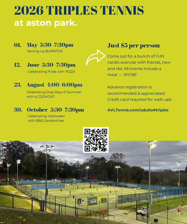 Asheville area Adult Try Tennis® programs are frequently run throughout the year at Aston Park Tennis Center and Asheville Racquet Club.